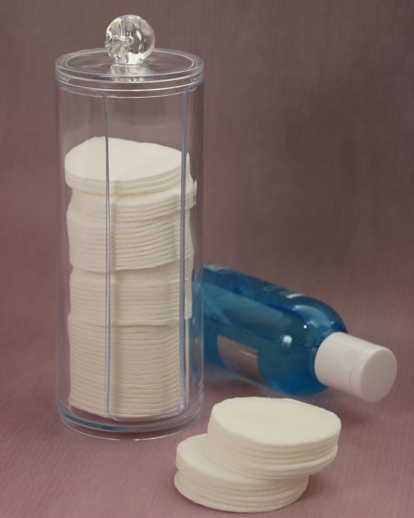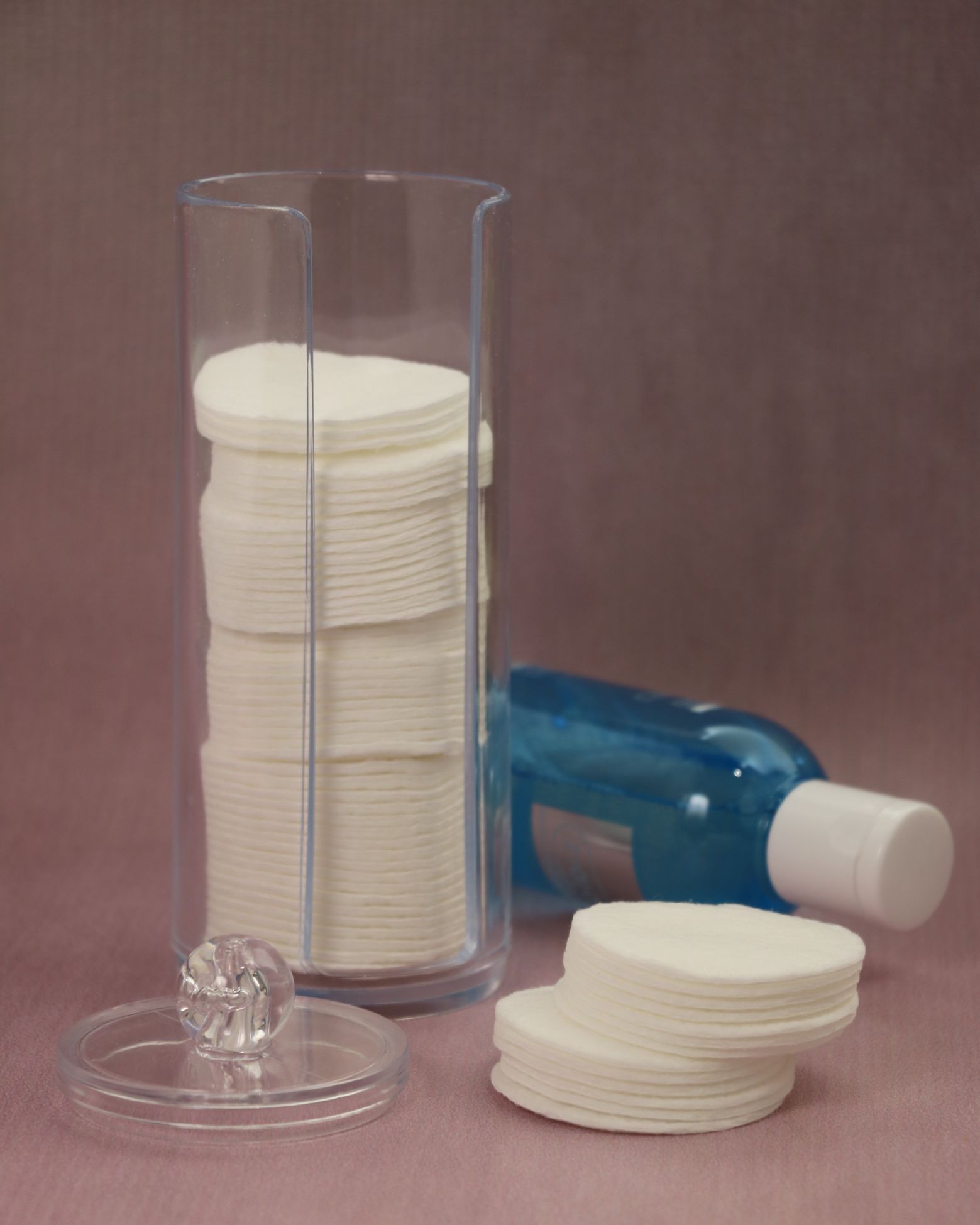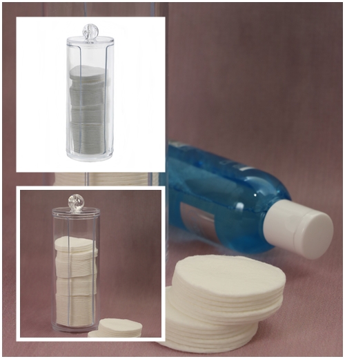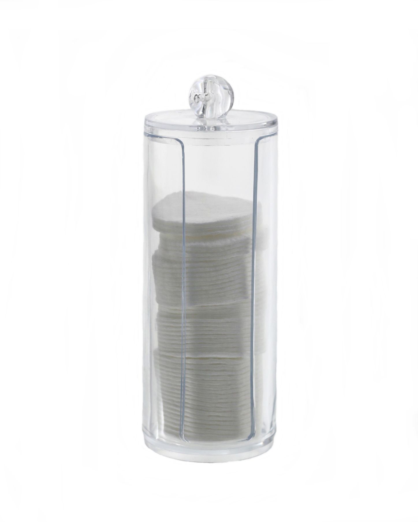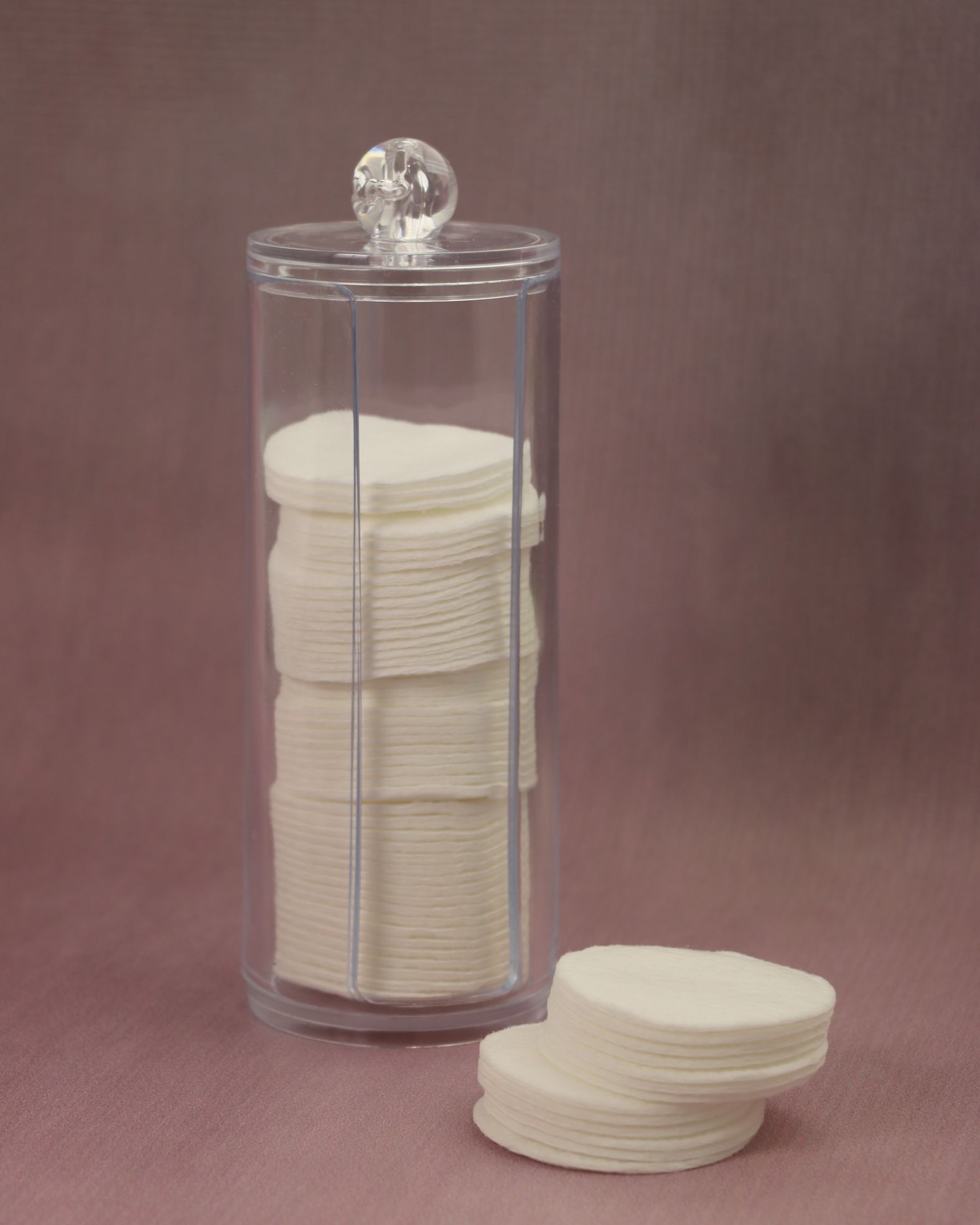 An elegant and practical container with a lid, designed for hygienic storage of cosmetic pads. The transparent material allows for easy visibility of the contents, and the decorative ball on the lid adds a touch of sophistication.