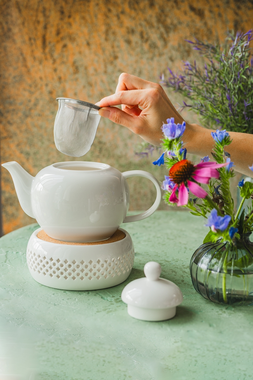 W zestawie stalowe sitko – z drobnej siatki ze stali nierdzewnej pozwala wygodnie parzyć herbaty liściaste, zioła i mieszanki owocowe.