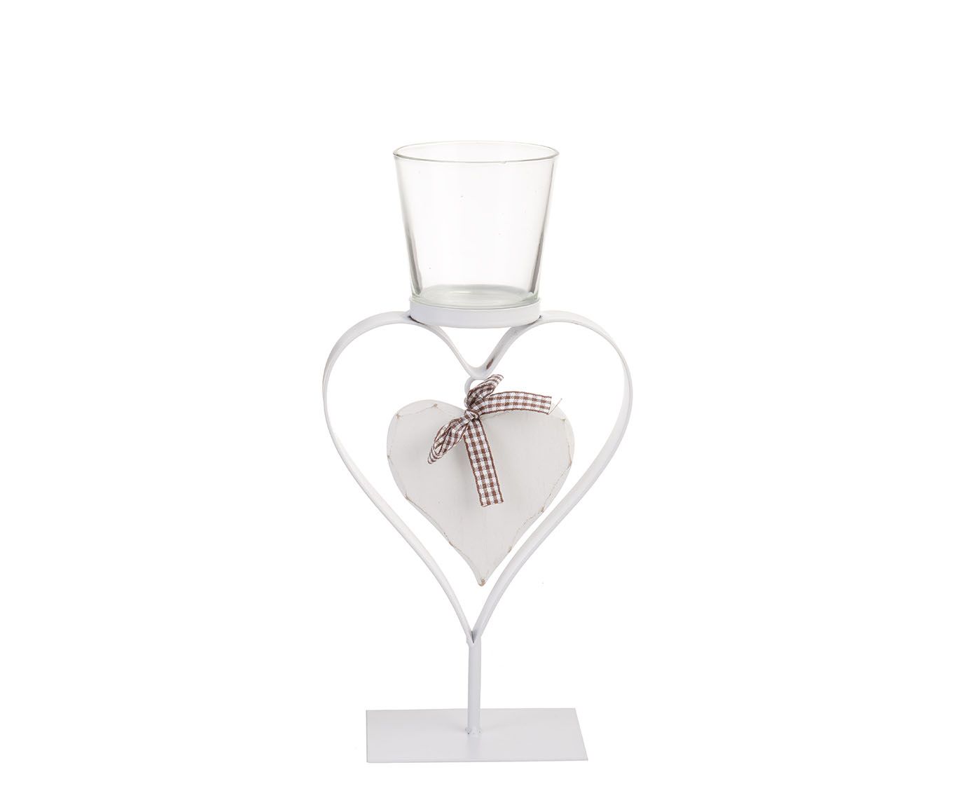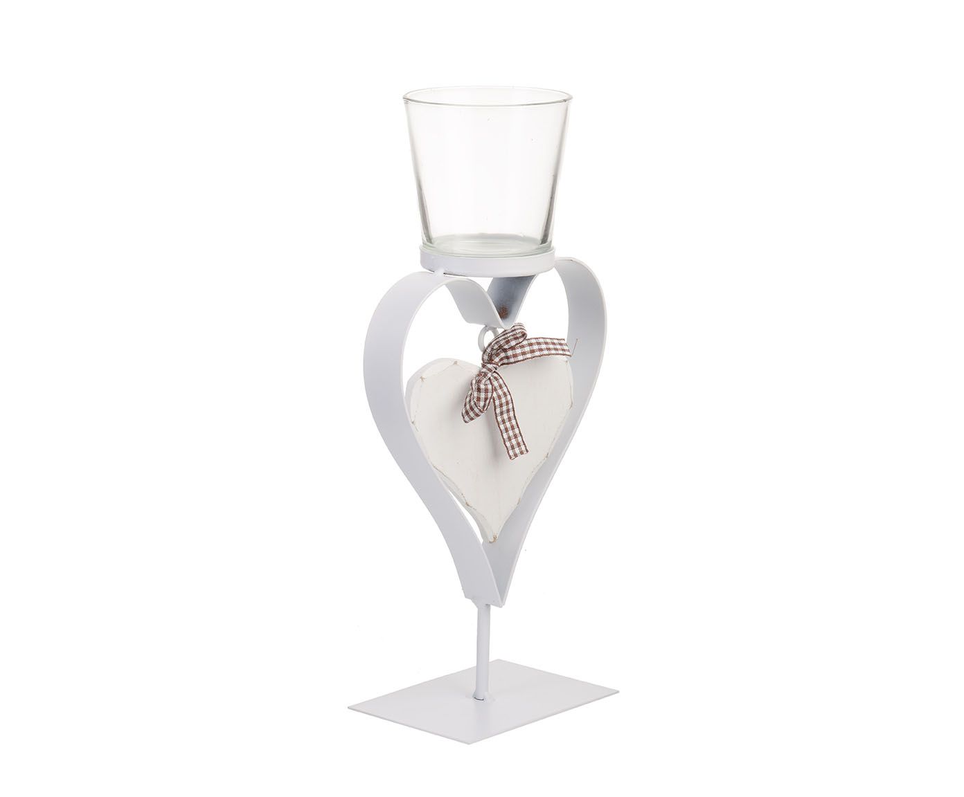 Dodaj romantyczny akcent do każdego wnętrza dzięki temu eleganckiemu świecznikowi. Wykonany z białego metalu, ozdobiony drewnianym sercem i wstążką, idealnie pasuje do standardowych świeczek.