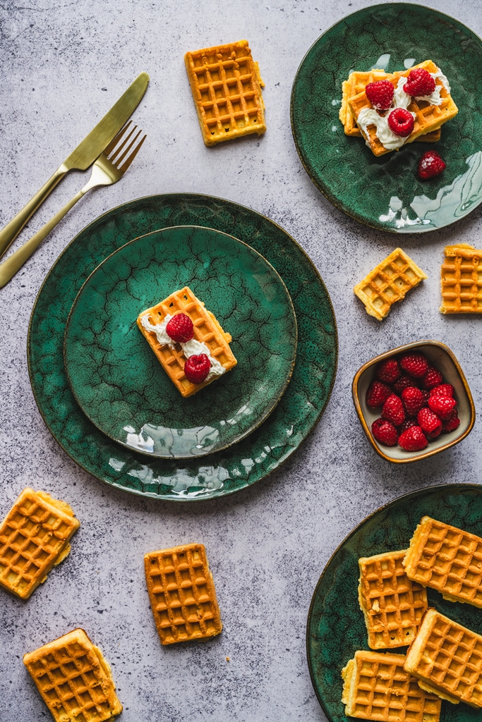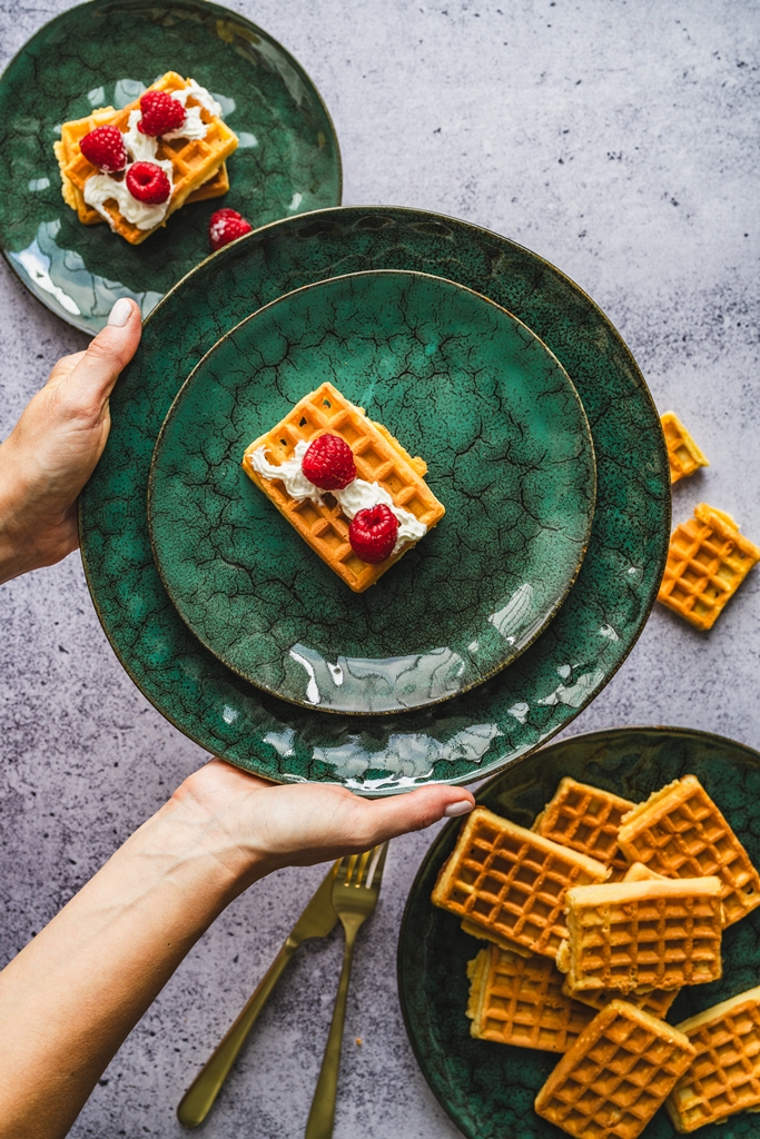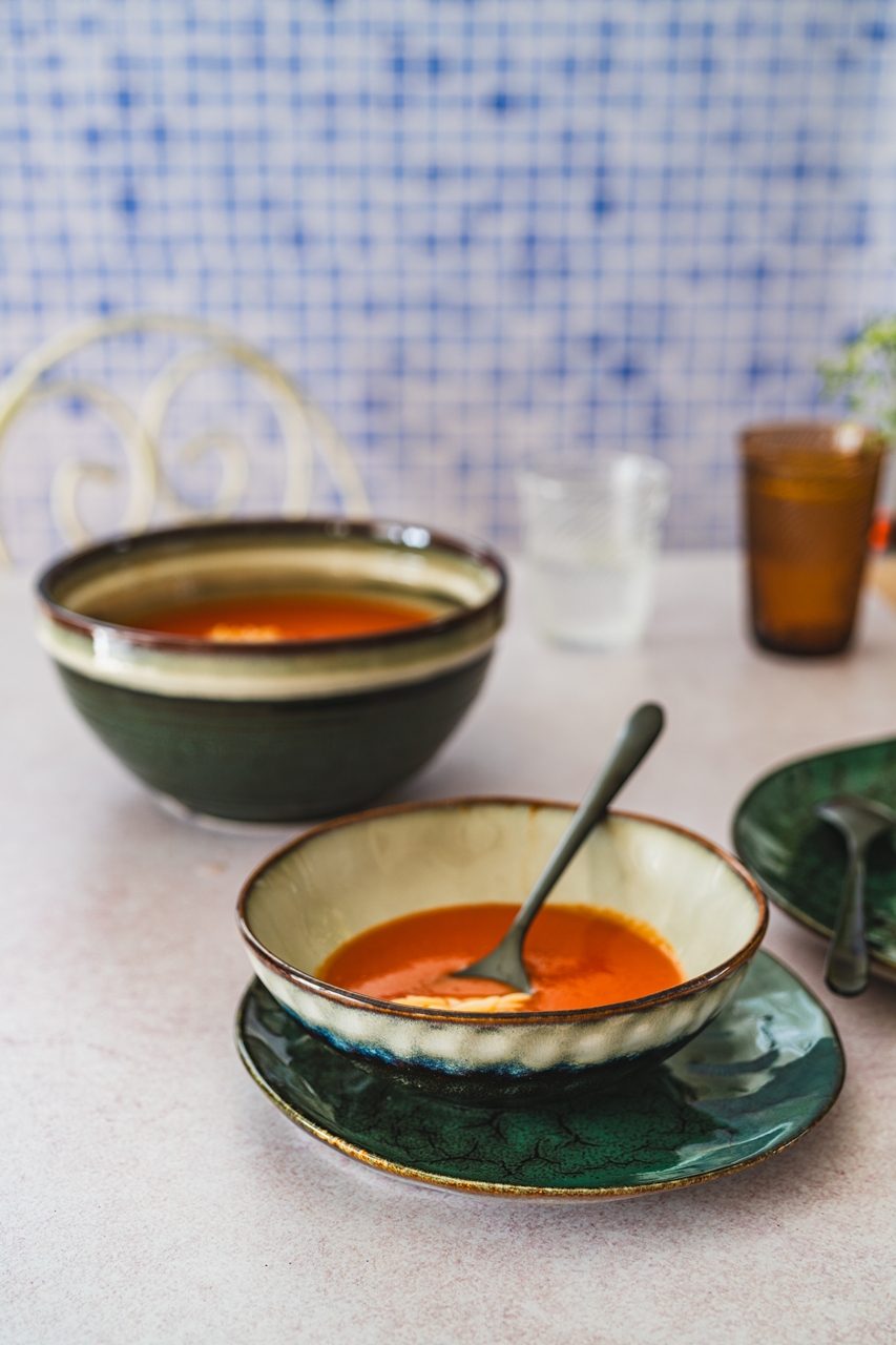 Każdy element zestawu wyróżnia się nie tylko głębokim, nasyconym kolorem, ale również kontrastującym, jaśniejszym brzegiem oraz wnętrzem miseczek, które subtelnie rozświetlają całość i dodają jej elegancji. Miseczki dodatkowo zdobi delikatnie żłobiona faktura zewnętrzna, podkreślająca ich rzemieślniczy charakter. Lekko nieregularne krawędzie talerzy są świadectwem inspiracji naturą i rękodziełem, nadając kolekcji ciepły, rustykalny wygląd.