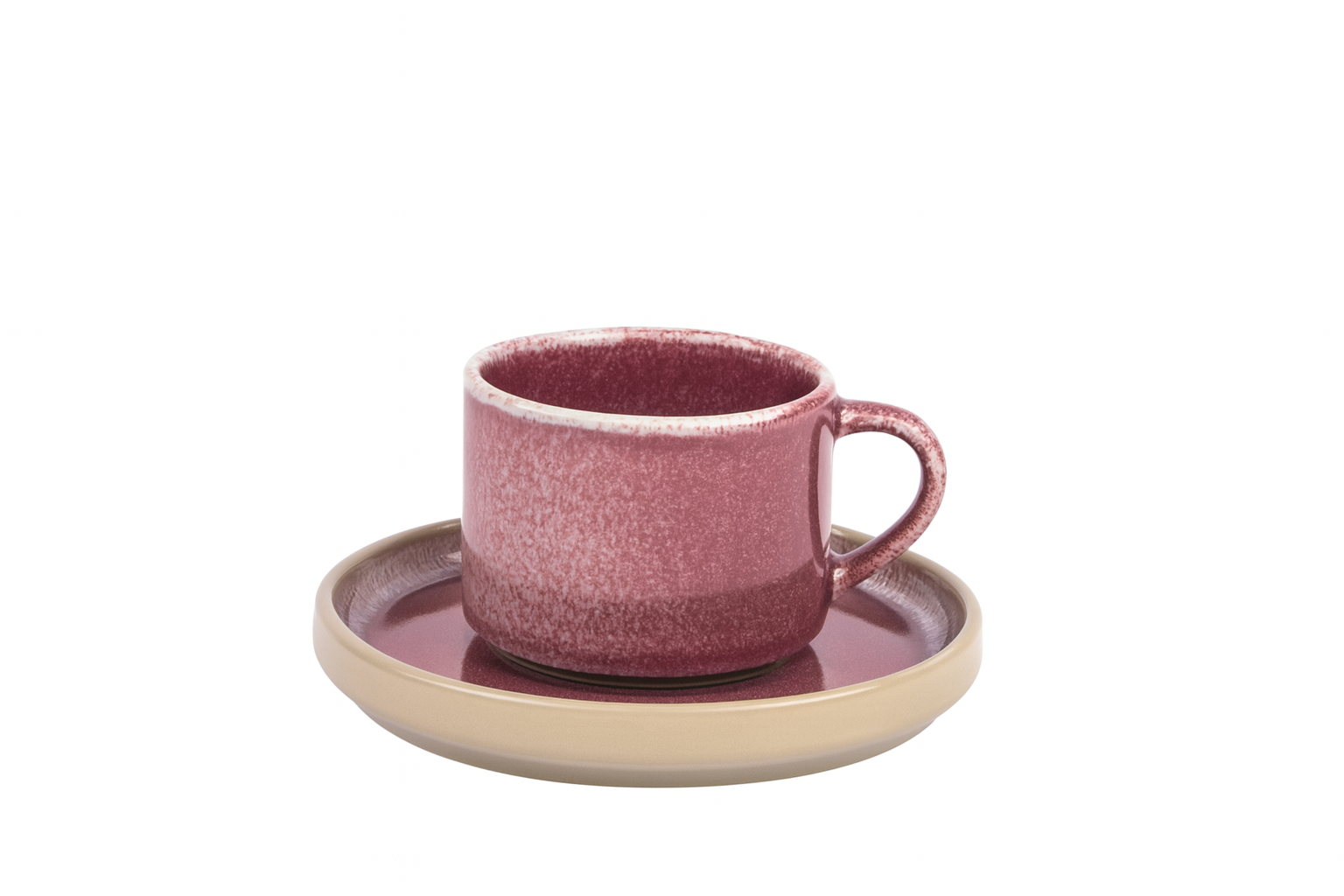 – the saucer complements the same color palette: a deep plum-raspberry center with a soft gray rim, creating a natural contrast that enhances the cup’s color.