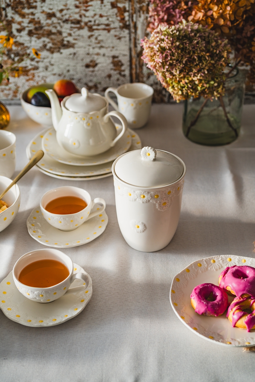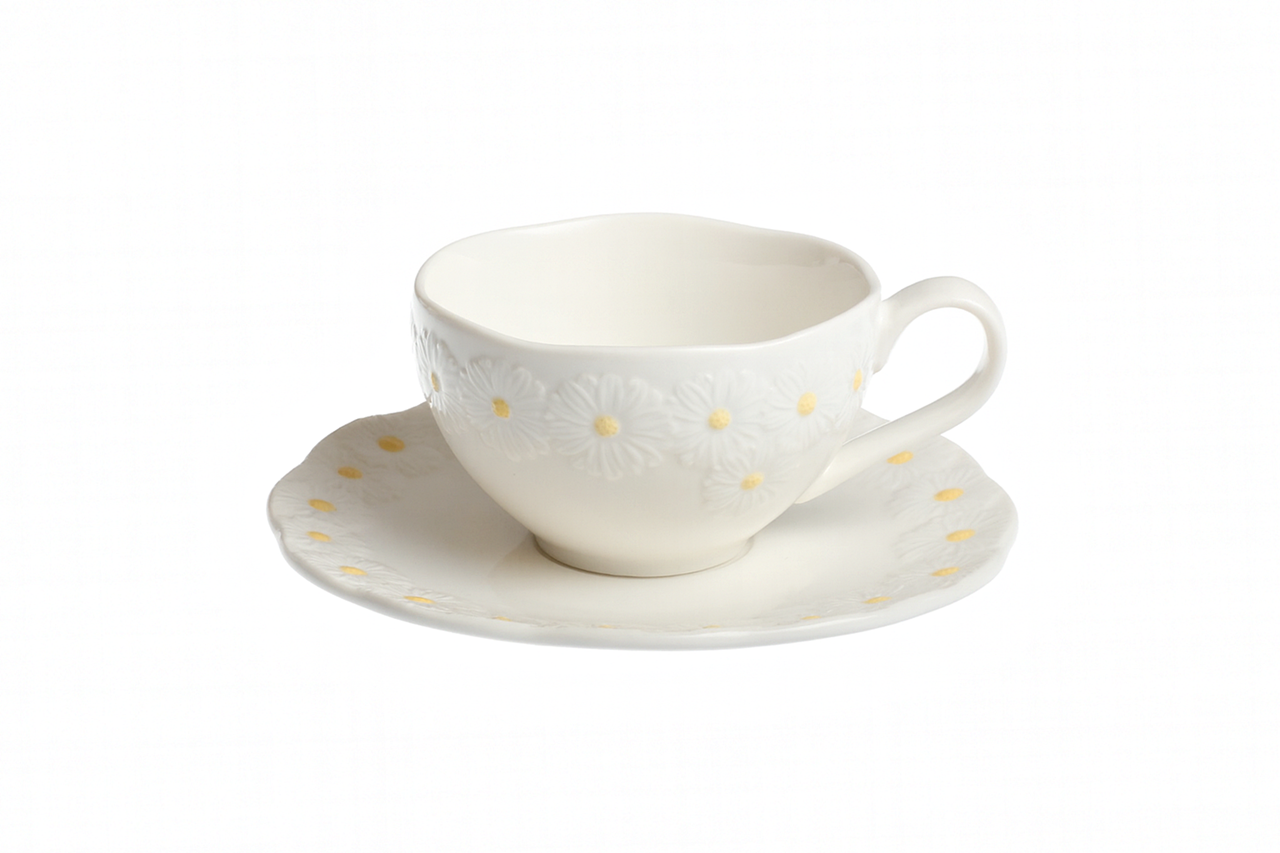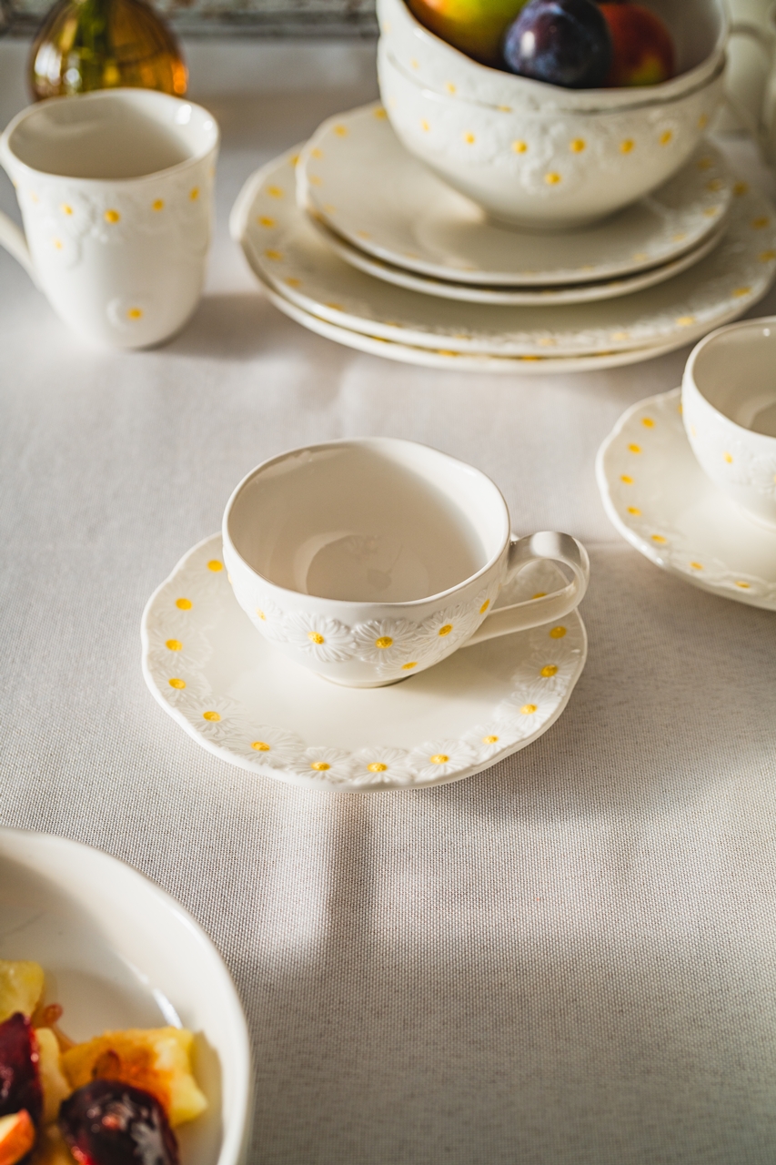 Subtelna filiżanka ze spodkiem z kolekcji Daisy to kwintesencja rustykalnego uroku i delikatnej elegancji. Jej powierzchnię zdobi ręcznie wykonany relief w drobne stokrotki z żółtym środkiem, który wprowadza do wnętrza ciepło i sielski nastrój.