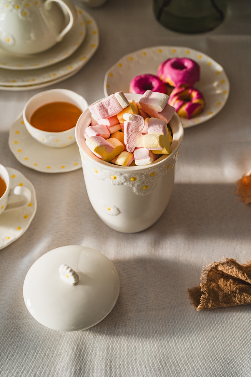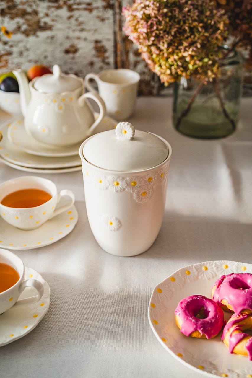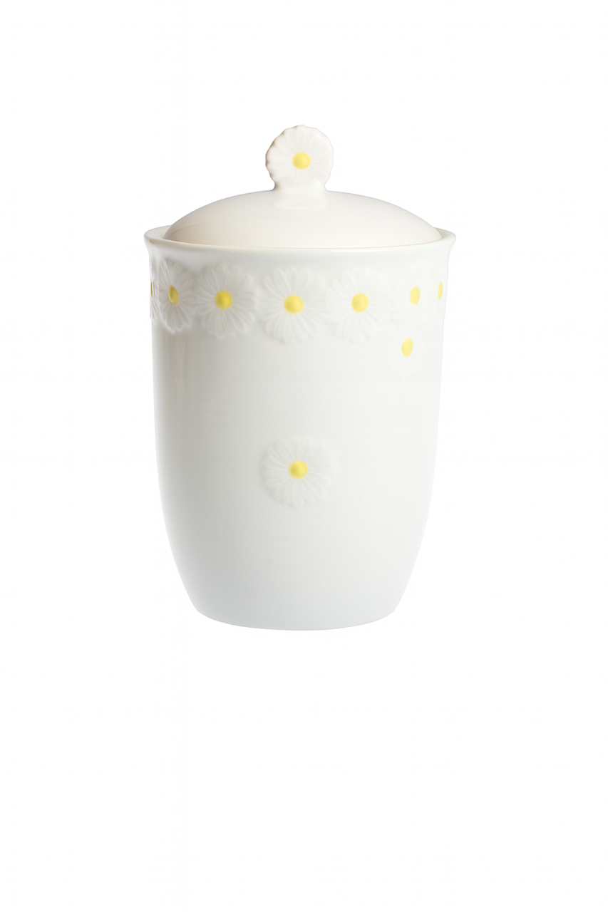 Pokrywka zakończona jest ozdobnym uchwytem w kształcie stokrotki, co dodaje całości wyjątkowego charakteru i lekkości. Pojemnik doskonale sprawdzi się do przechowywania cukru, kawy, herbaty, suszonych owoców, słodkości.