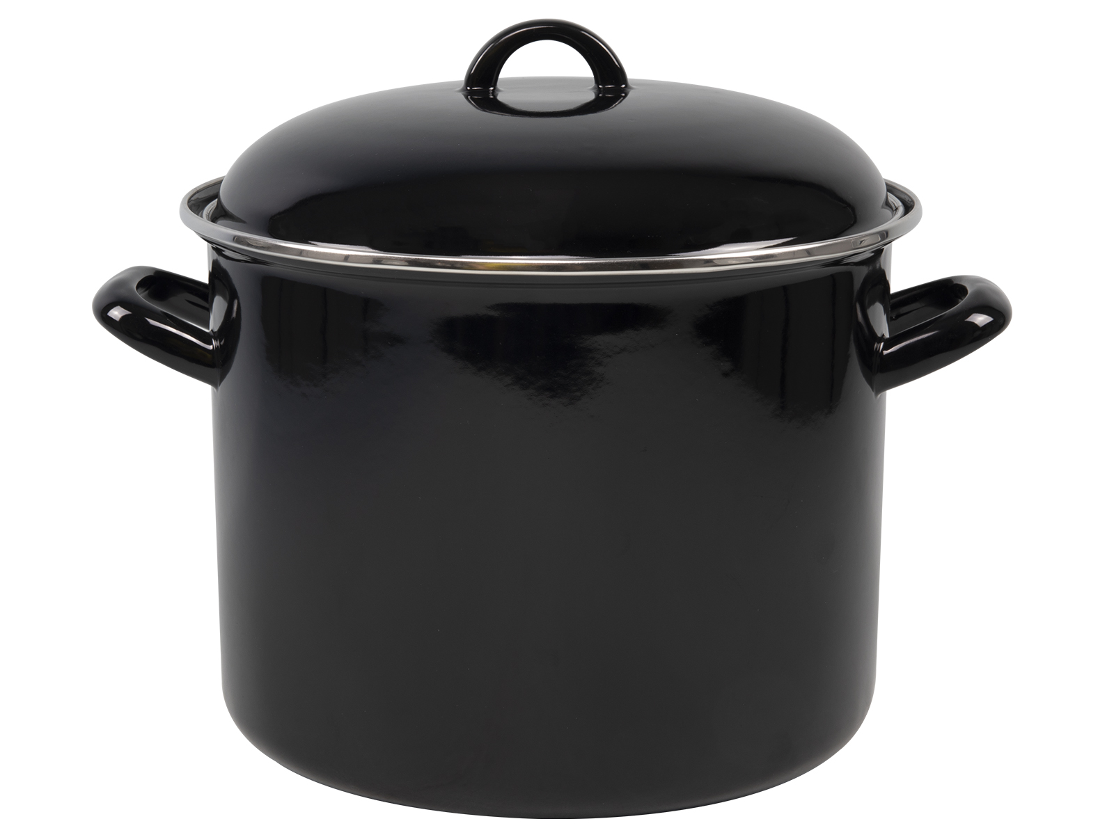 An enamelled black pot with a high shape, ideal for cooking various dishes. The enamel coating provides resistance to high temperatures and makes the pot easy to clean.