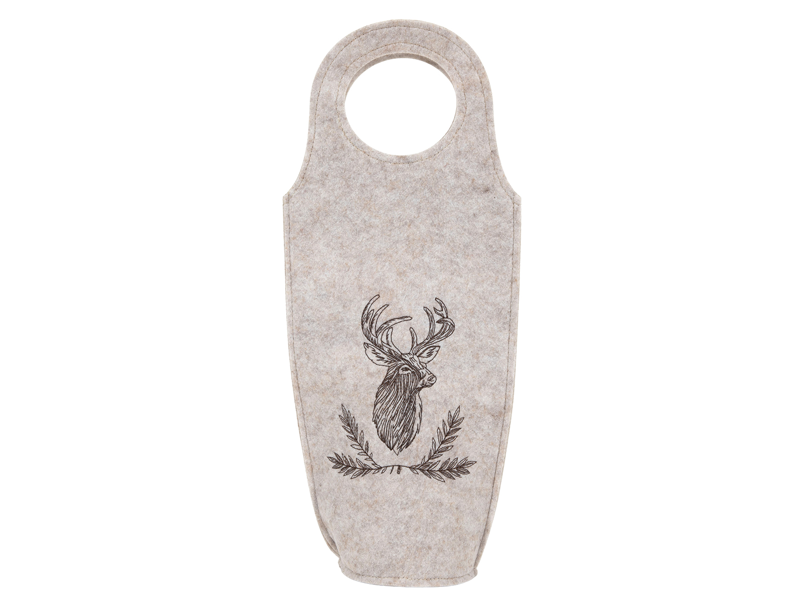 Felt wine bottle bag measuring 39 × 16 cm, featuring a moose design in beige. Perfect for gifting a holiday wine while adding a festive, woodland touch to the occasion.