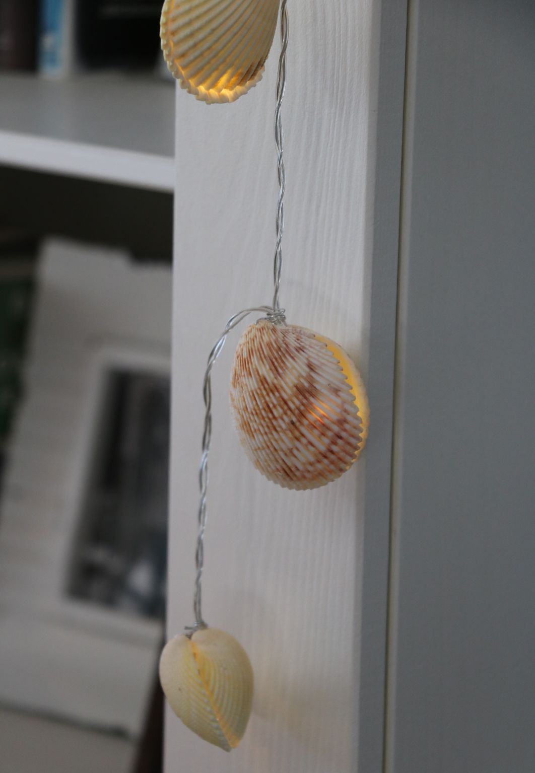 LED lights shaped like double shells, featuring 10 LEDs that emit warm light. Perfect for beach or nautical-themed decorations, creating a relaxing atmosphere.