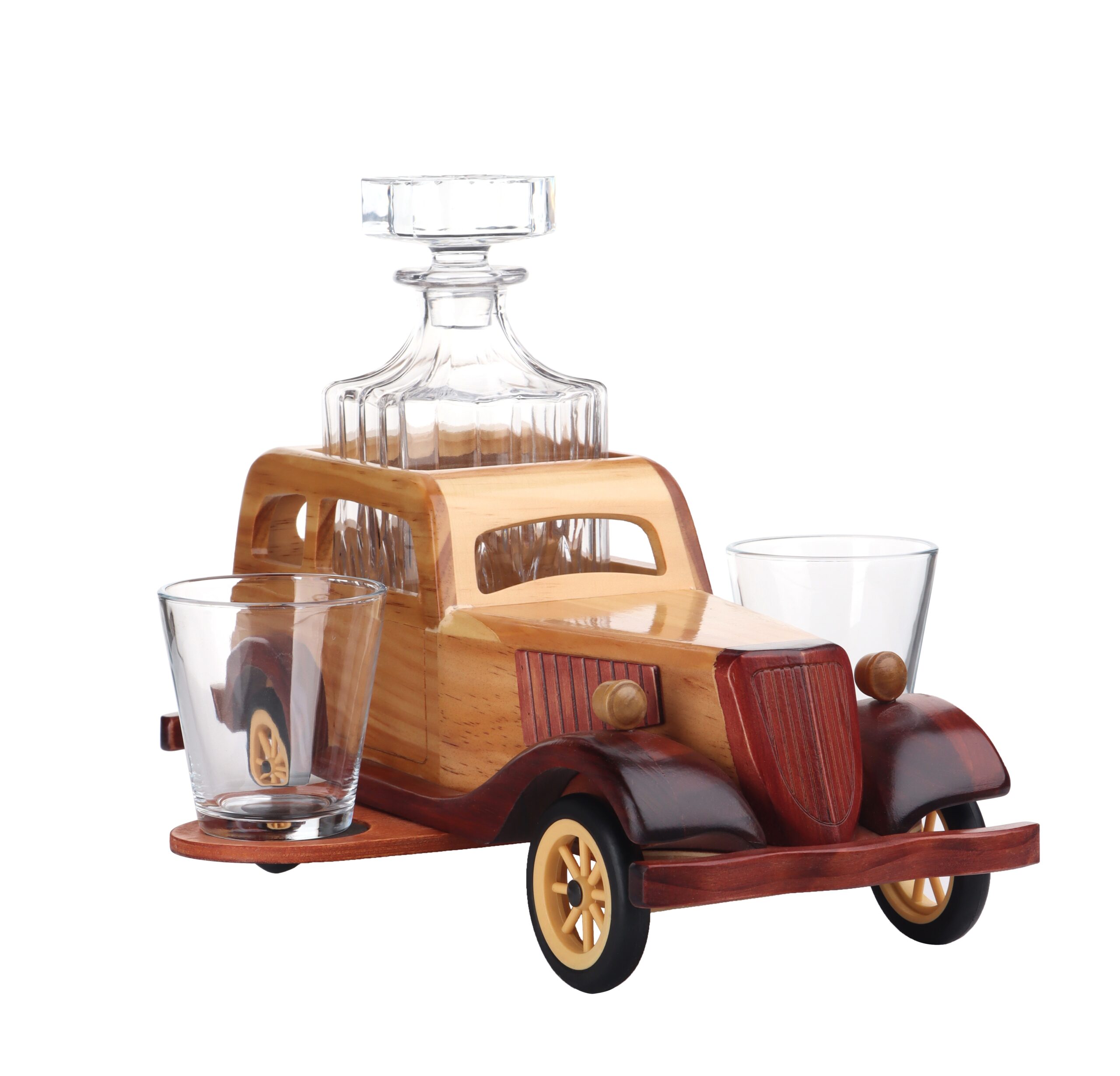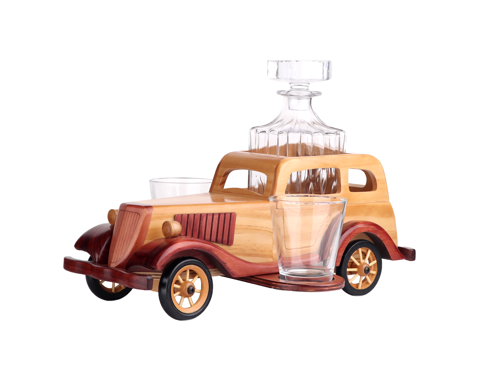 Szklana Karafka na Stojaku AUTO Klasyk BEŻ to wyjątkowy zestaw, który łączy elegancję szkła z solidnością drewna bukowego. Zestaw ten idealnie nadaje się do serwowania różnorodnych napojów, stanowiąc jednocześnie efektowną dekorację stołu. Wyróżniający się design w kształcie klasycznego samochodu, w połączeniu z funkcjonalnością karafki i dwóch szklanek, sprawia, że zestaw ten doskonale wpisuje się w każde wnętrze, dodając mu wyjątkowego charakteru.