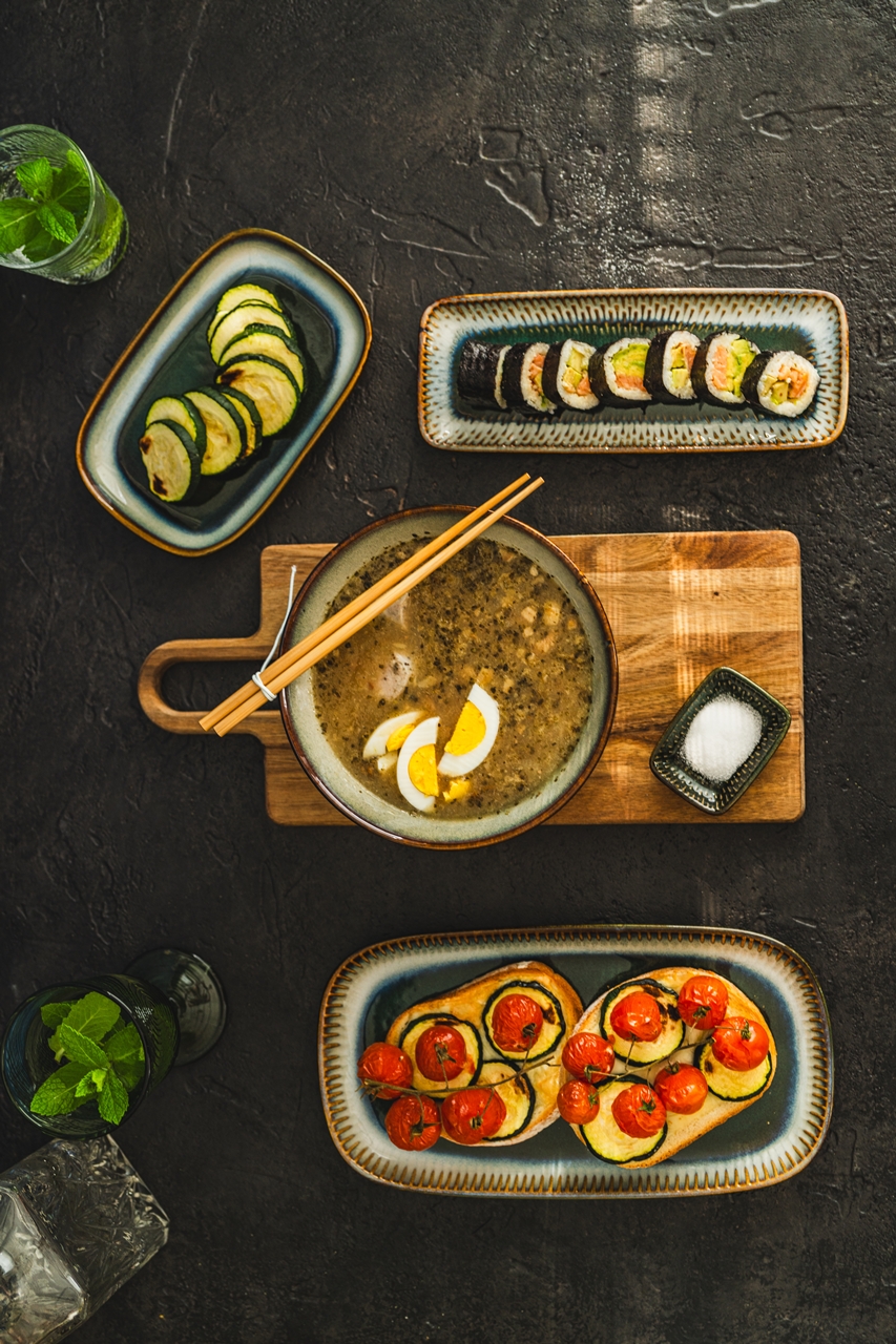 The OMBRES line is a unique collection of ceramics available in various colors, ideal for serving sauces, dips, and appetizers. Each product in this series features a unique appearance, as no two items are identical. Thanks to a special coloring technique, the colors blend harmoniously, creating a striking mosaic effect. The OMBRES collection includes a variety of products that combine aesthetics with functionality, making them suitable for use in both the oven and microwave. The products are available in a mix of colors such as green, dark green, and navy blue, giving them a distinctive character that complements any kitchen.