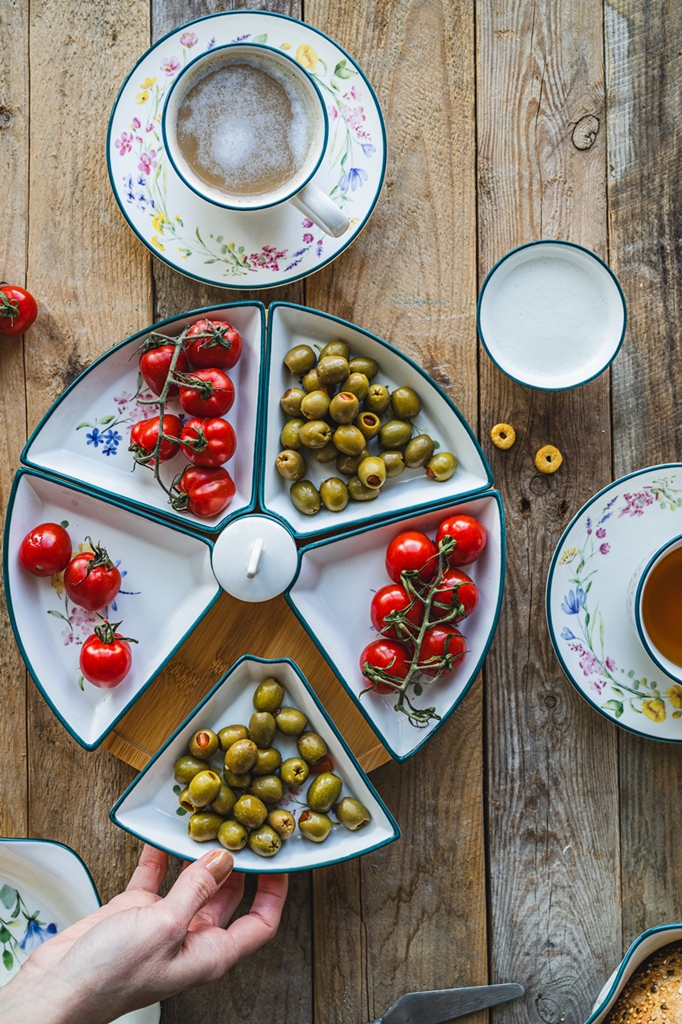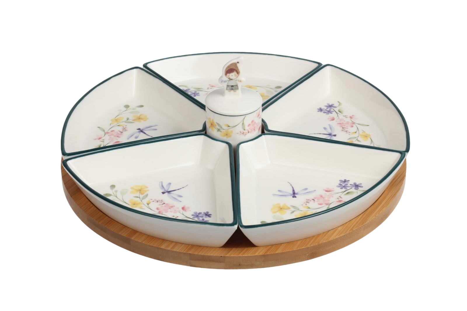 PATERA ceramiczna OBROTOWA na bambusie 27,5 cm PANI KWIATEK 7 elementów z uroczym motywem łąki – idealna, aby celebrować wspólne chwile! Stwórz niepowtarzalną atmosferę podczas spotkań z bliskimi!