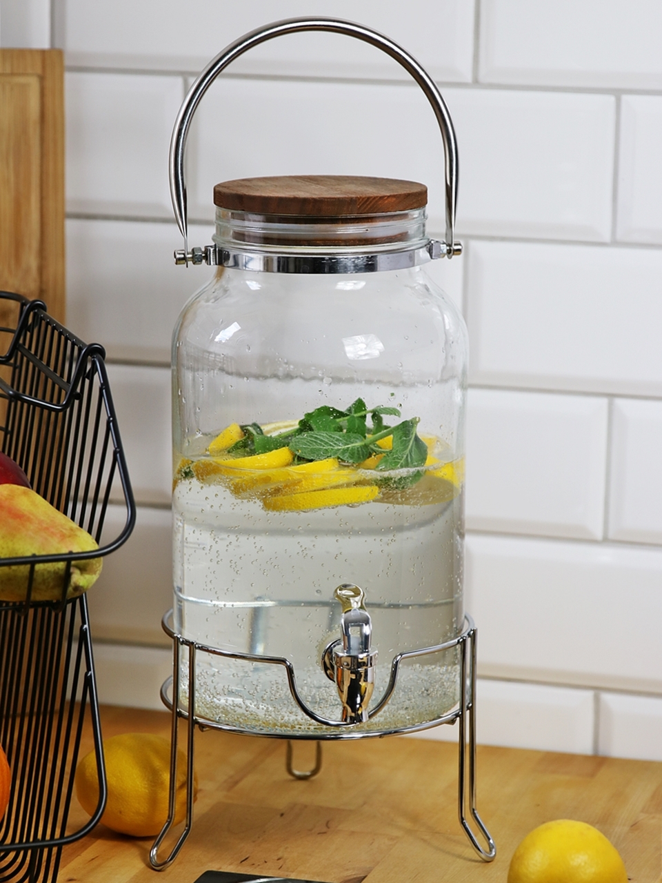 Glass Jar with Faucet, 6L, Stainless Steel Handle, and Wooden Lid
