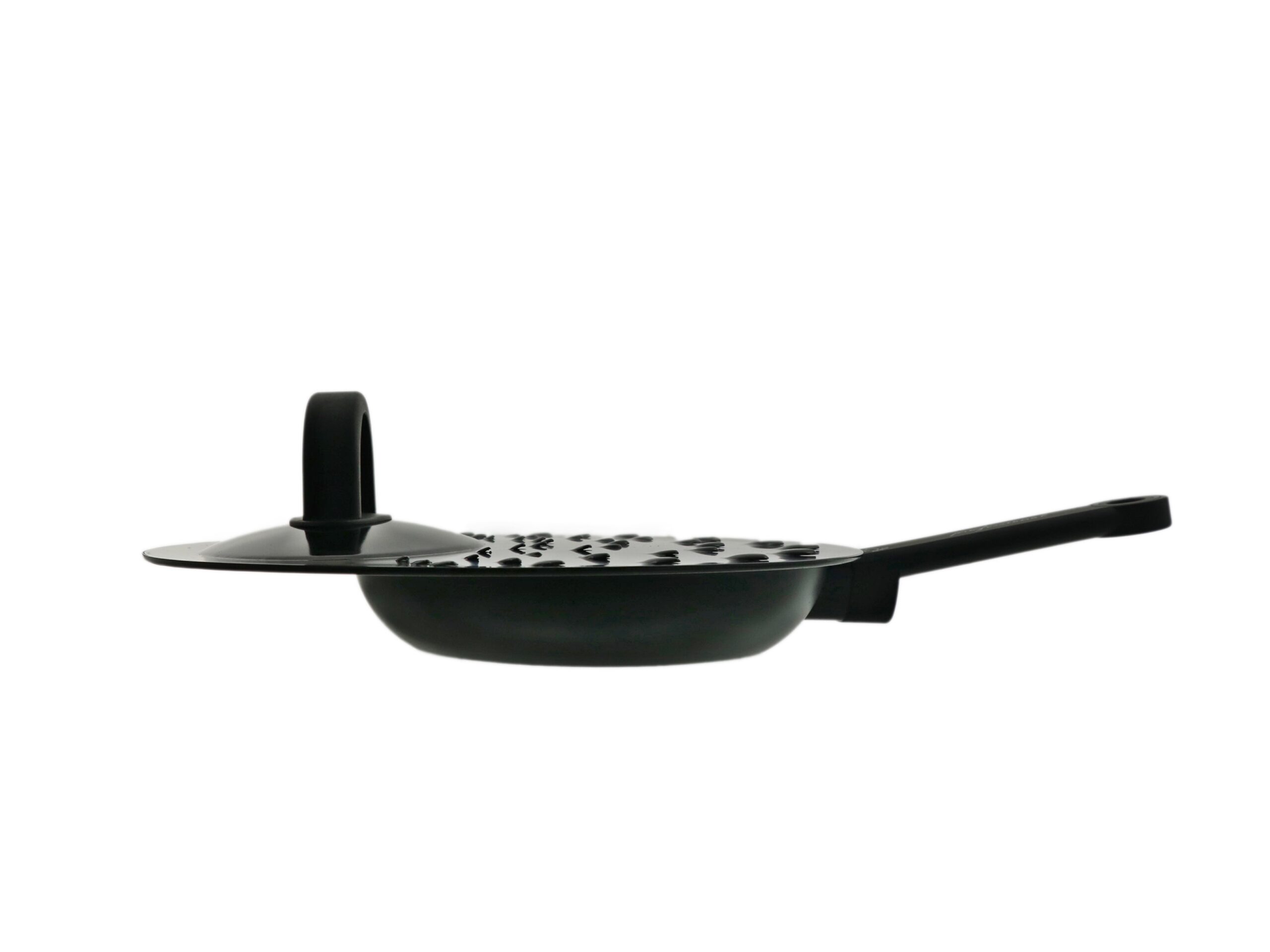 A universal stainless steel lid designed to fit pots and pans up to 30 cm in diameter. Its versatile design enhances functionality compared to  lids made for specific cookware. The lid is made from durable material with a non-stick coating, which makes cleaning easier and prevents food from sticking.