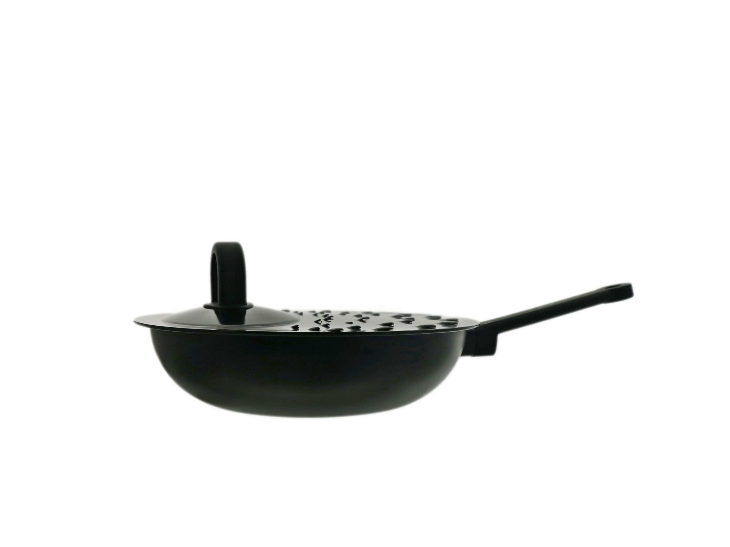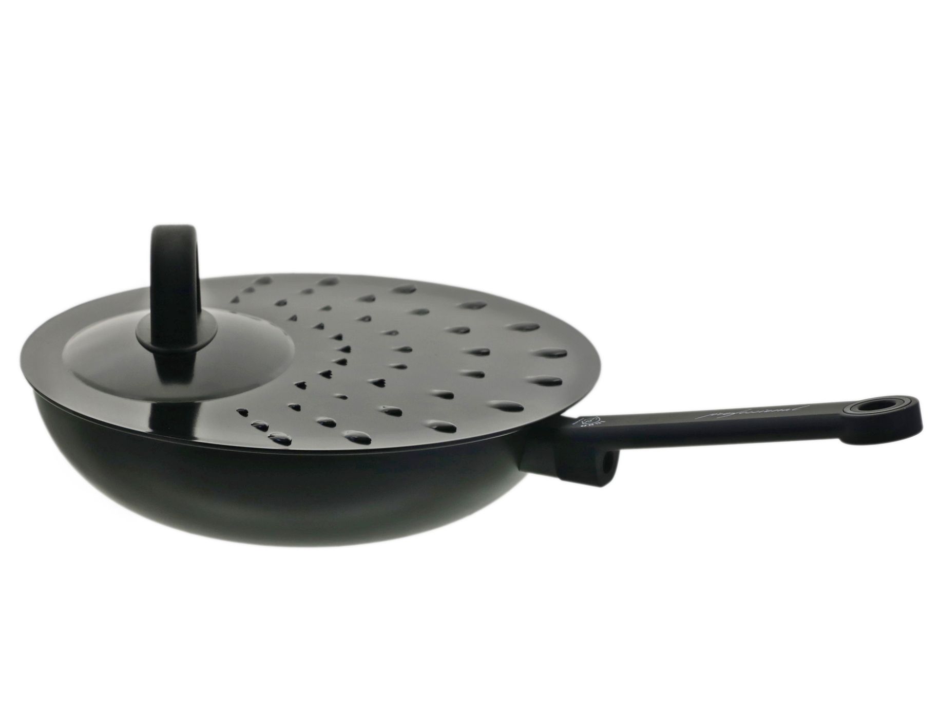 Uniwersalna pokrywa stalowa, która pasuje do garnków i patelni o średnicy do 30 cm. Jej wszechstronny design zwiększa funkcjonalność w porównaniu do pokrywek dedykowanych do konkretnych naczyń. Pokrywa została wykonana z wytrzymałego materiału i pokryta warstwą nieprzywierającą, co ułatwia jej czyszczenie i zapobiega przywieraniu jedzenia.