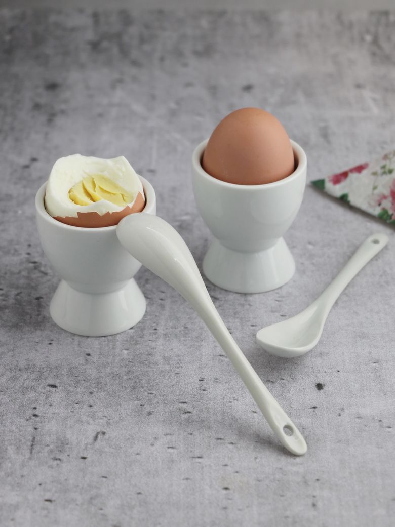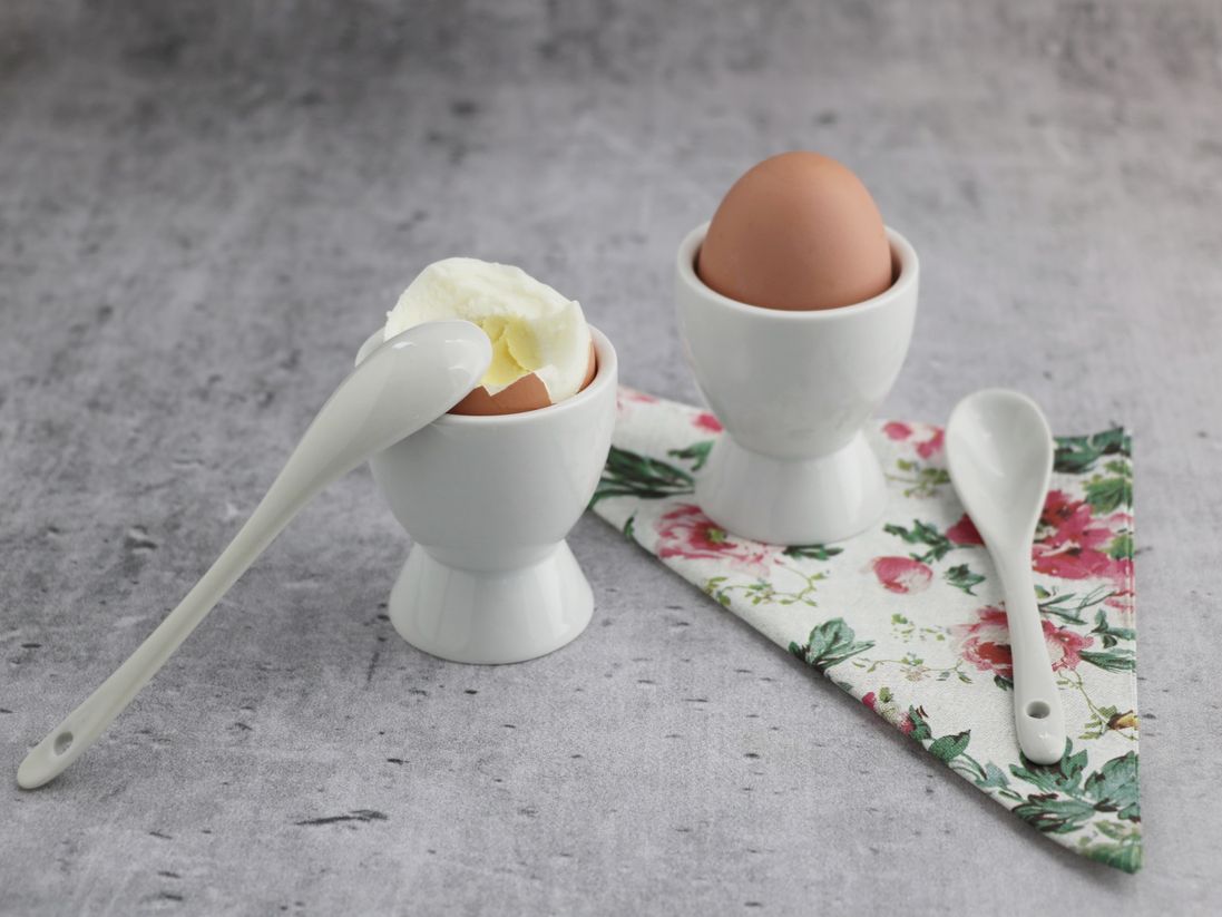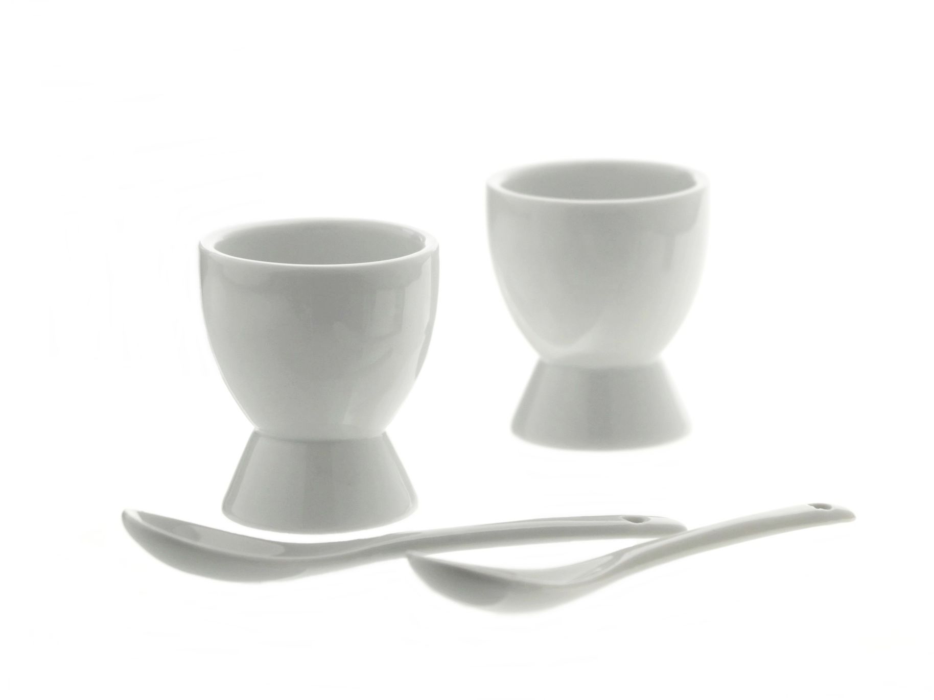 Eleganckie podstawki pod jajka w zestawie 2 sztuk, wykonane z porcelany, w komplecie z łyżeczkami. Dzięki prostej formie i białej barwie, podstawki idealnie wpasują się w estetykę stołu oraz pozostałej zastawy, a łyżeczki dodają funkcjonalności do serwowania.