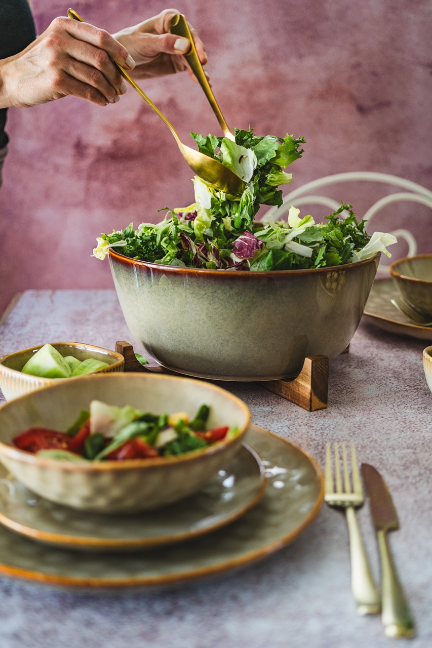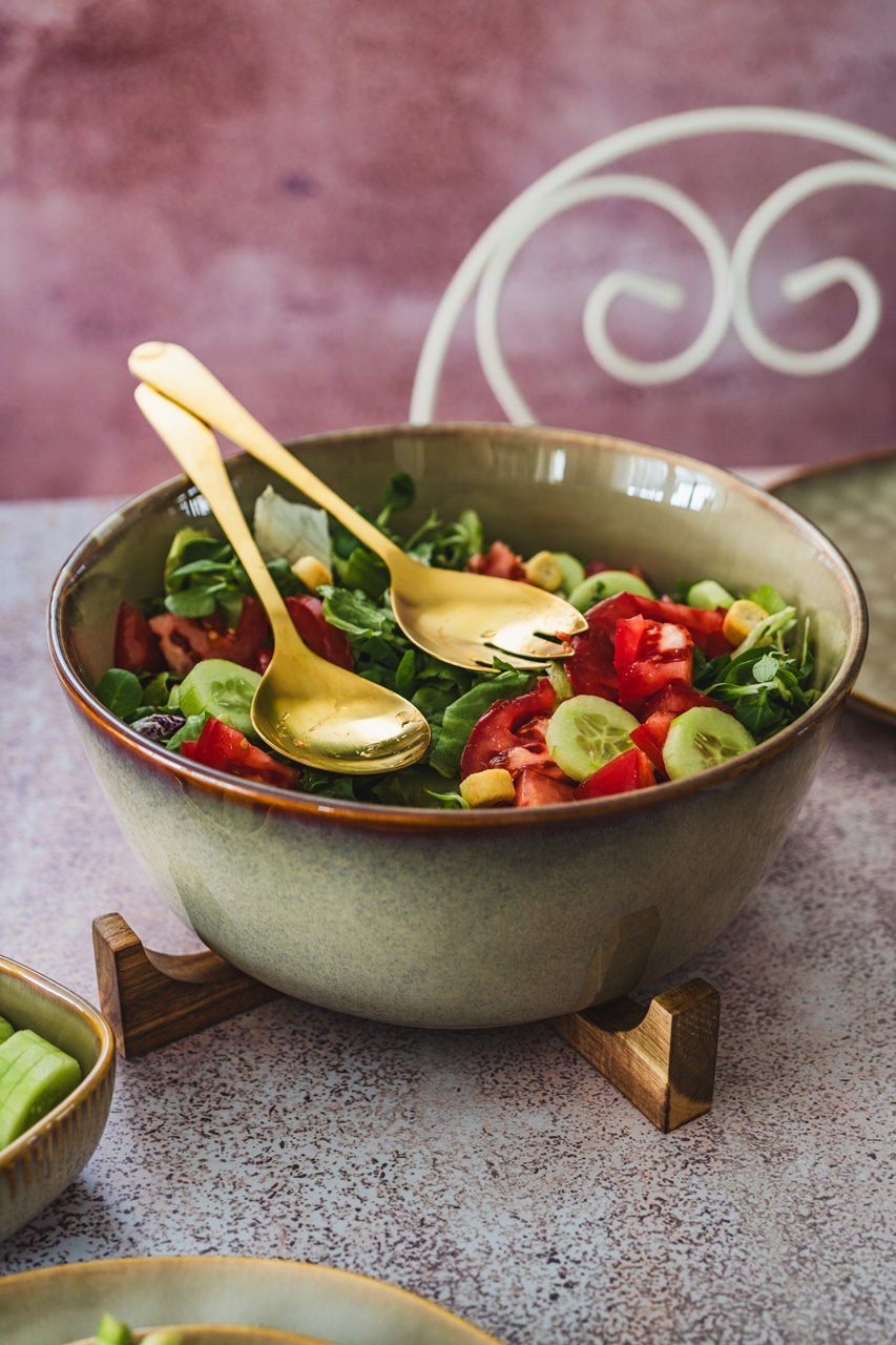 This set of steel salad cutlery in elegant gold matte is an excellent choice for modern dining settings. It includes two long pieces: a spoon and a fork, perfect for serving salads. Made of steel, it adds sophistication to any meal.