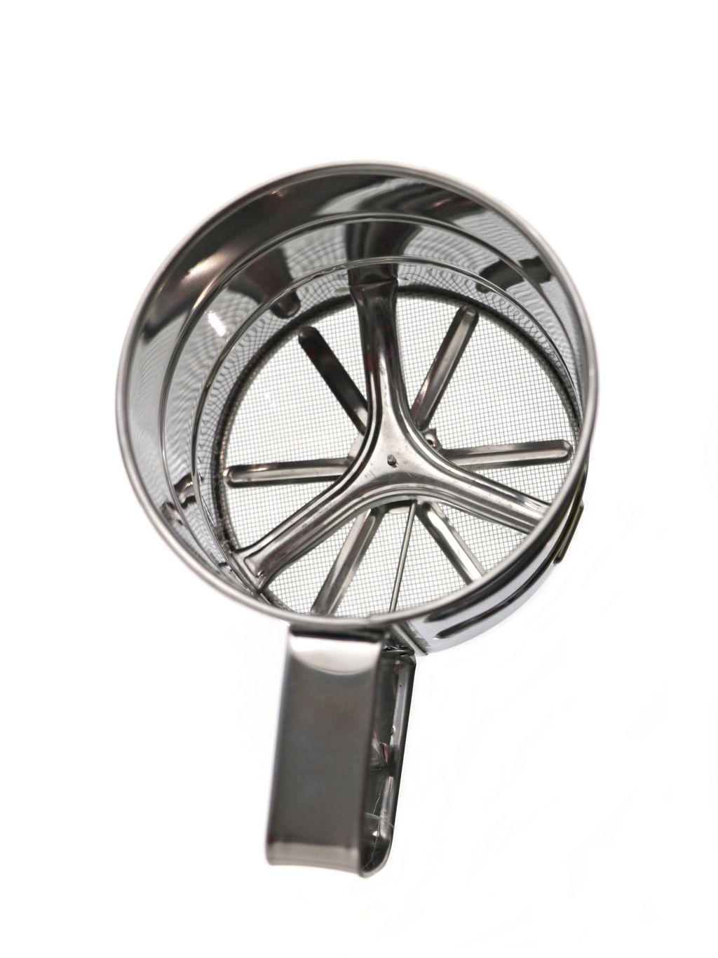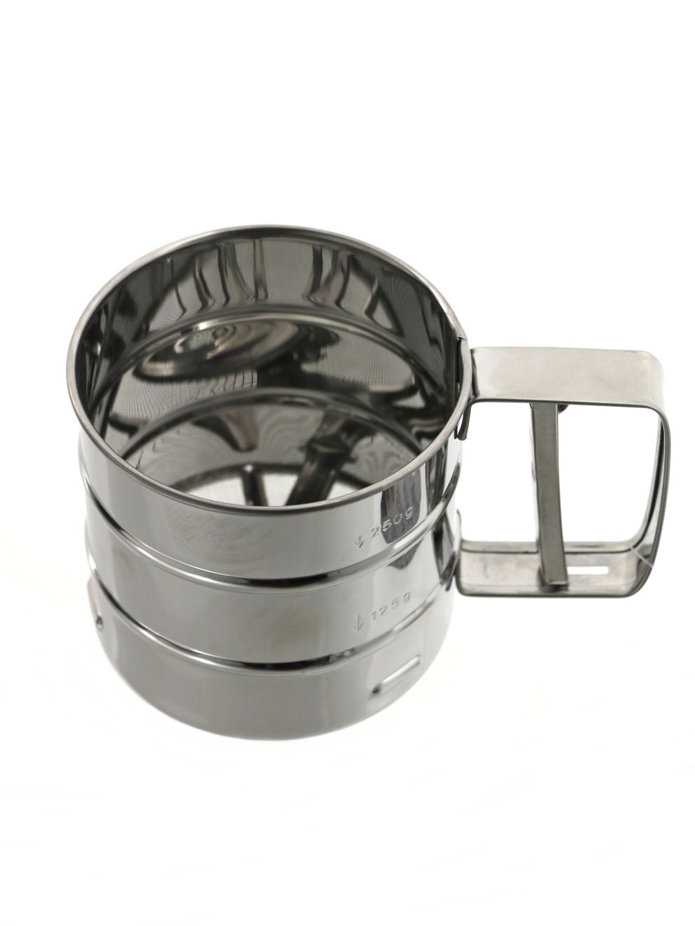 Wykonany ze stali kubek z sitkiem. Wystarczy nacisnąć rączkę, a potrójne, łopatkowe śmigiełko obracając się, powoduje przesiewanie mąki lub cukru pudru.