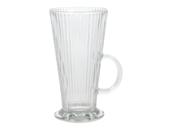 A 300 ml glass ideal for serving both hot beverages (up to 80°C maximum) and cold drinks. Its sturdy handle ensures comfortable holding, while the ribbed exterior adds aesthetic appeal and improves grip. The inside of the glass is smooth.