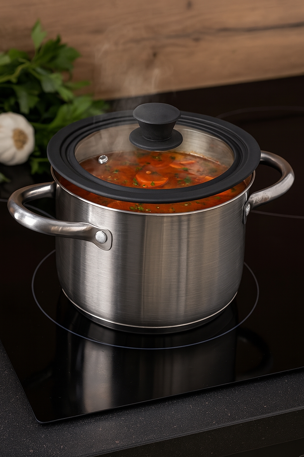 – the lid is made of glass and has a silicone rim, which improves its fit on various types of cookware. It is suitable for cooking, frying, or stewing – it reduces splattering and helps retain heat inside the pot. The transparent surface allows you to check the contents without having to lift it. This is a practical and universal solution – especially useful when the original lid from the set is lost, broken or does not fit other cookware