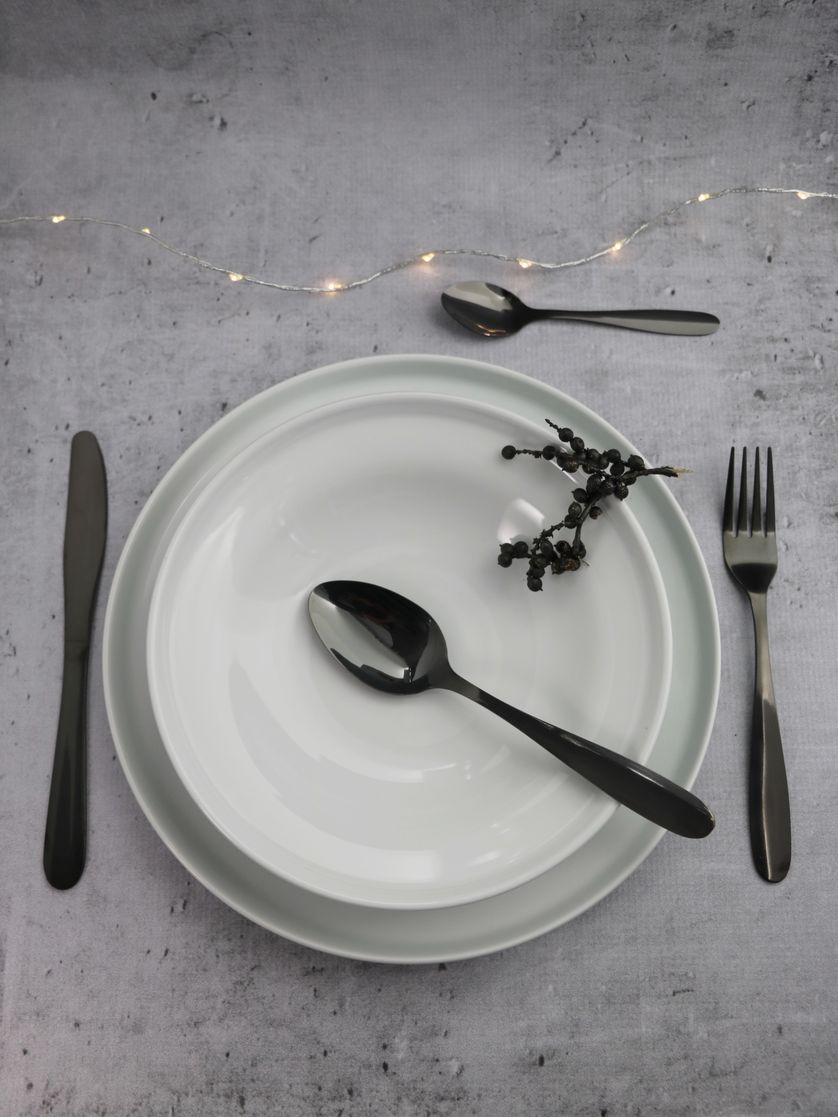 This 16-piece set of stainless steel cutlery with a black matte coating offers an elegant and modern solution for any dining setting. The set includes 4 knives, 4 dinner spoons, 4 forks, and 4 teaspoons. With its delicate appearance, this cutlery set is perfect for complementing modern kitchen and dining room interiors.