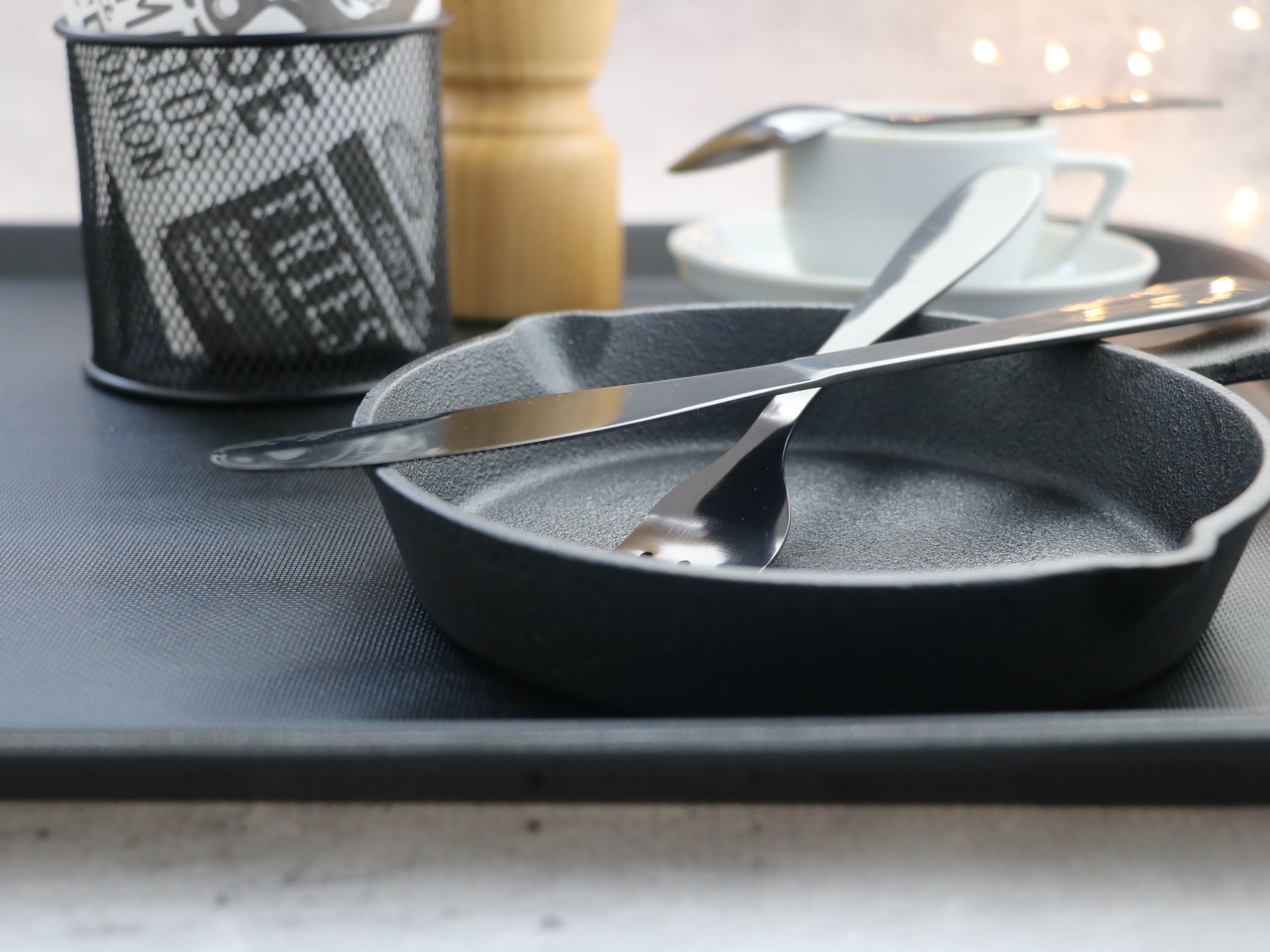 Taca wykonana z tworzywa sztucznego, pokryta materiałem antypoślizgowym. Posiada rant, który zapobiega rozlewaniu się napojów. Jest lekka, a jednocześnie sztywna, wytrzymała i łatwa w utrzymaniu czystości. Doskonale sprawdzi się w restauracji lub kawiarni.