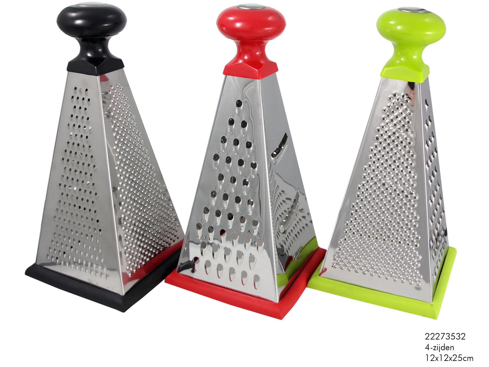 This 4-sided grater is made of stainless steel, plastic, and silicone. The silicone base ensures the grater stays in place during use. The plastic handle on top makes the grater very handy. Perfect for any kitchen, it facilitates grating cheese, vegetables, fruits, and other ingredients.