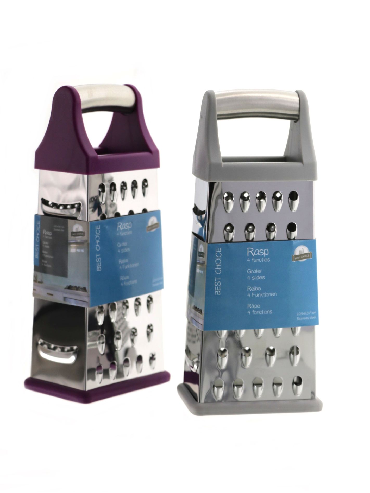 4-sided grater made of stainless steel, plastic, and silicone. The silicone base ensures the grater stays in place during use. The plastic handle on top makes it very handy. Perfect for any kitchen, this grater helps with grating cheese, vegetables, and fruits.