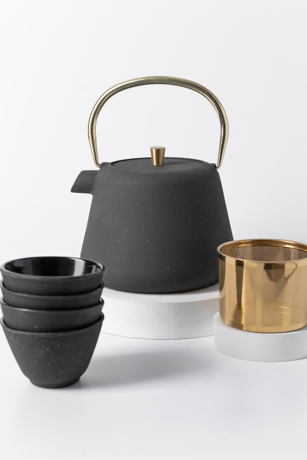 The beautiful white color of the teapot ensures that the set will fit into any kitchen, adding a distinctive charm. The golden steel tea strainer makes it easy to brew your favorite tea, while the four matching teacups complete the set, offering a harmonious way to serve your brew. Tea brewed in this cast iron teapot has a unique taste and aroma that will be appreciated by every connoisseur.